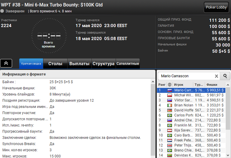 Чемпионом турнира стал покерист из России итальянского происхождения Марио Карраскон. За первое место Марио заработал 11 760$ (из них 5 760$ баунти).