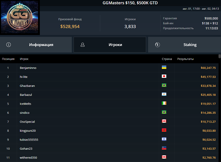 Как вы уже поняли, победу в турнире одержал игрок из Украины с никнеймом "Benjaminno", который заработал 60 240$ за первое место.