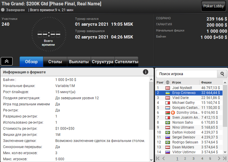 Украинец Егор Слипенко стал раннер-апом турнира The Grand
