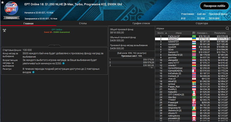 Прошлой ночью он стал раннер-апом нокаут-турнира EPT Online 18 на PokerStars стоимостью 1 050$ с гарантией 500 000$ и заработал 59 570$ + баунти 14 730$. Эти призовые пока что являются крупнейшими в карьере новоиспечённого покериста.