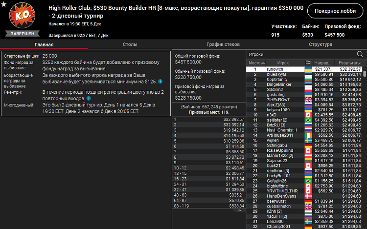 Этой ночью завершился ивент High Roller Club Bounty Builder HR с бай-ином 530$ и гарантированными призовыми в 350 000$.