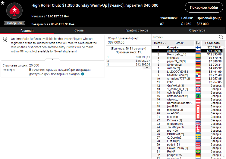 Благодаря неплохому количеству входов в 87 энтри из которых 31 ре-энтри, гарантию турнира удалось перебить более чем в два раза и сформировать призовой фонд в размере 87 000$.