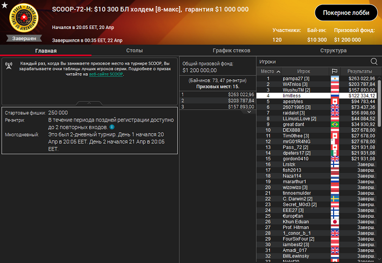 В турнире хайроллеров SCOOP-72-H было собрано 120 входов, которых более чем хватило, чтобы перебить гарантию и сформировался призовой фонд в размере 1 200 000$.