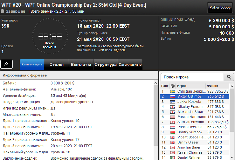 Сегодня ночью завершился турнир WPT Online Championship с бай-ином 3 200$ и гарантией 5 000 000$, раннер-апом которого стал Виктор Устимов с призовыми 865 500$.