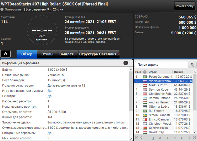 В этом турнире преуспел российский покерист Владислав Иванов. Он по итогам сделки в хедз-апе стал раннер-апом и заработал 116 630$ призовых.