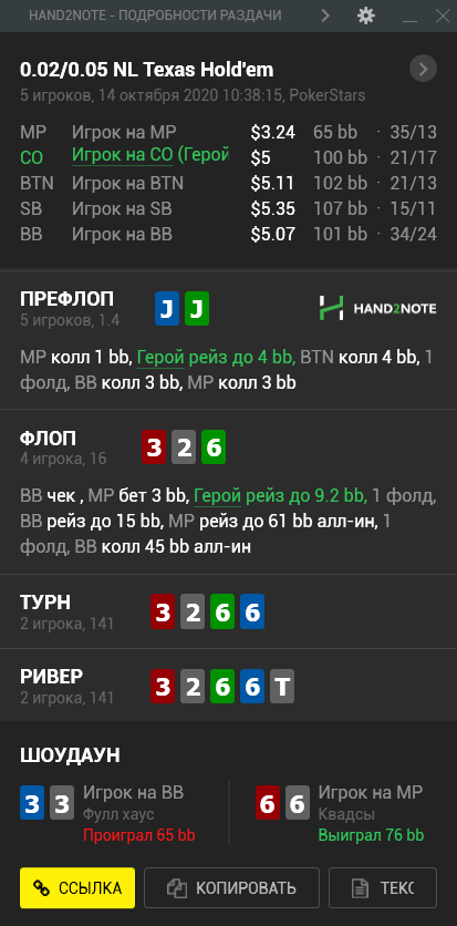 Естественно у меня не обошлось без тупых раздач, в которых я откровенно не добрал. К примеру в этой раздаче мы играем против полу рега, 3Bet у него 8%, большая агрессия по флопу и терну в 3Bet поте, а вот на ривере у него 24% что является низкой и соответственно он мало блефует.