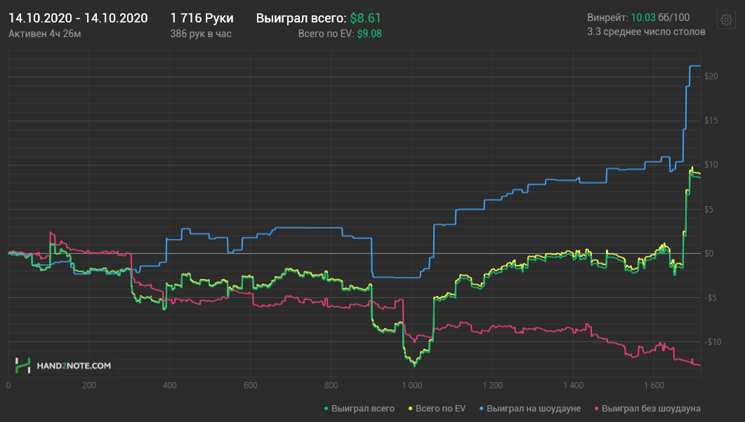 И отдельно передам тебе привет, привет дисперсия. Я не могу жаловаться что мне не везет или плохая полоса в покере, на против все довольно не плохо складывается. Но последние два дня у меня выходят интересные графики, весь день я катаю около нуля или в минус и за последние 100 раздач вывожу все в плюс.
