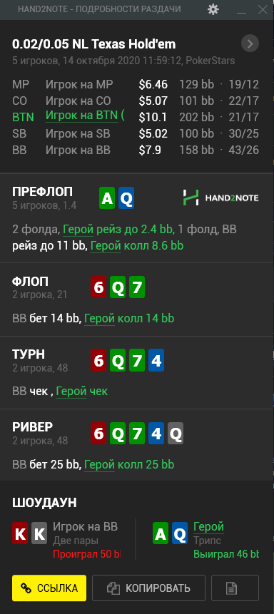Фулхаусы 66, 77, 44 я считаю можно исключить, это руки вероятнее всего он уведет в колд колл. Какие ни будь 56s тоже вероятнее всего уведет тоже в колд колл, не говоря уже о Q6, Q7, Q4. И у нас есть железное велью против Q c кикиром слабее и переигранных карманных пар.