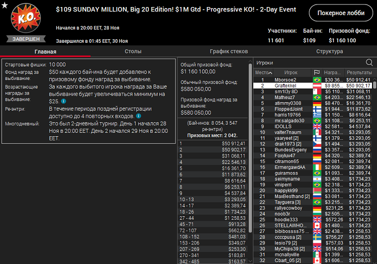На PokerStars в рамках серии The Big 20 Rewind прошёл нокаут-турнир Sunday Million с неизменным бай-ином в 109$ с гарантией в 1 000 000$.