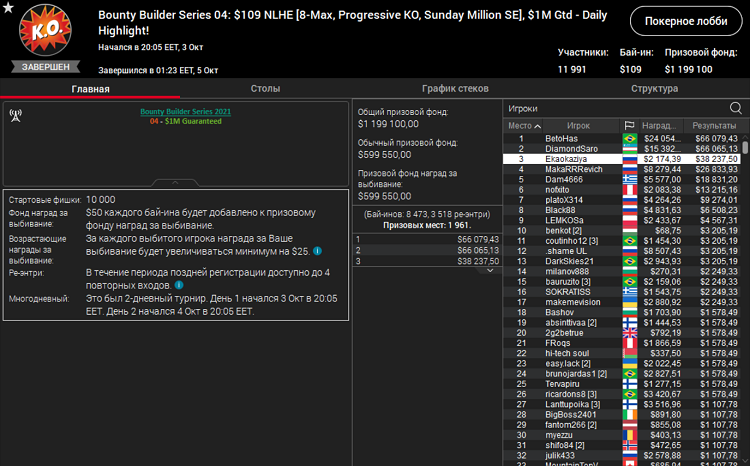 На PokerStars сейчас проходит серия нокаут-турниров Bounty Builders. В рамках этой серии завершился регулярный турнир Sunday Million за 109$.