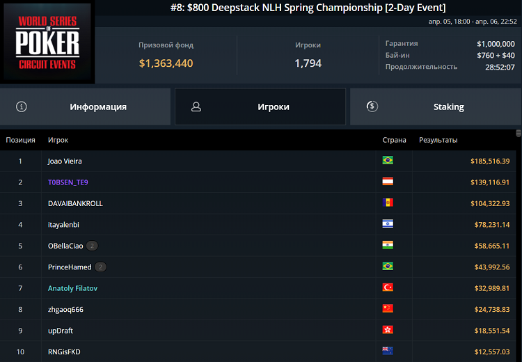 Ивент WSOPC #8: 800$ Deepstack NLH Spring Championship насобирал большую поляну в 1 794 входов.