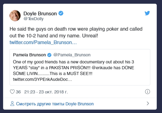 Имя Дойла Брансона у многих ассоциируется с конкретной покерной рукой – с теми самыми «десять-два», которые дважды принесли ему победу на Мировой серии покера. Интересно, что этот факт известен настолько широко, что эту руку стали называть «рукой Брансона» по всему миру. И даже в камерах смертников, где в покер играют заключенные, можно услышать такое выражение!